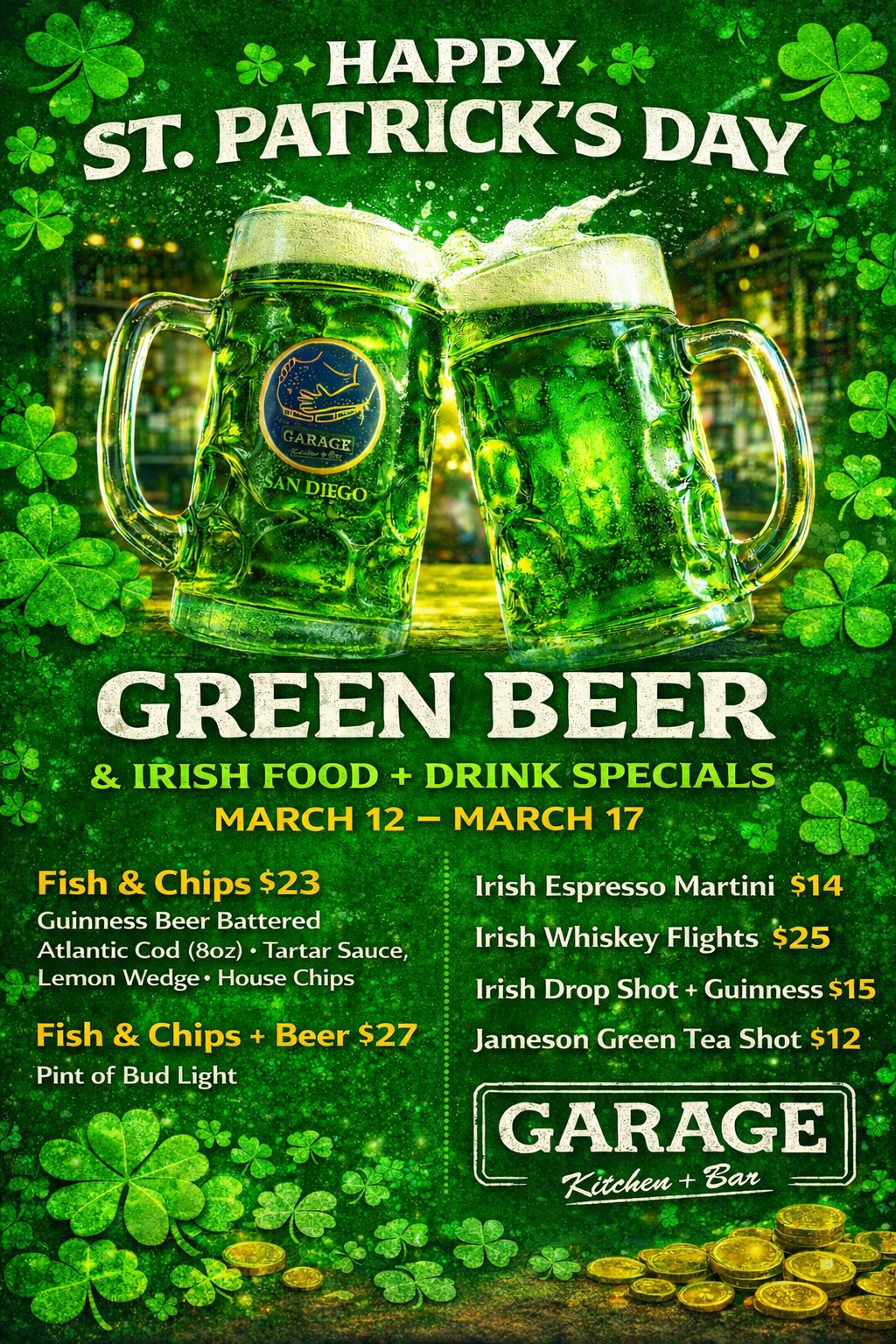 Garage is known for having the best Happy Hour in San Diego, 51% Off all Drinks & $3 Off Apps 3-6pm.