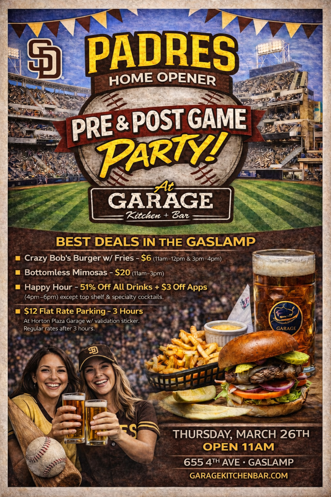 Whether you’re heading to Petco Park or just want to soak up the Opening Day energy in the Gaslamp, Garage is the perfect place to gather with friends, enjoy game-day specials, and celebrate Padres baseball.